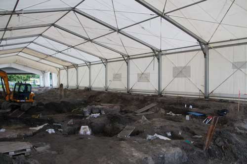 Vi började i det stora tältet som skyddar lämningarna av kyrkan (den som låg norr om Säveån). Man har hittat en stenlagd väg fram till kyrkan samt en stor pelare som skulle hindra att kyrkan rasade på grund av sättningar. Den beryktade ”Göteborgsleran” ställde till det även för medeltidens byggare. Dessutom har kyrkogården återfunnits och hundratals skelett har grävts fram. Alla dessa fynd var oväntade då det på 1960-talet hävdades att allt arkeologiskt material då hade tagits bort!