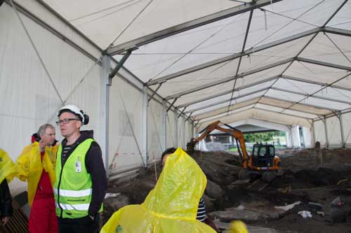 Även om stadens kyrka kan vara spännande så anser jag att husen och gatorna kring kyrkan är än mer spännande. Inklämd mellan kollektivtrafikens hållplatser ligger den andra stora ytan där man just nu håller på att undersöka de historiska lämningarna. Där har en av stadens större gator hittats och den leder av en slump rakt mot den gångtunnel som byggts under spårområdet!