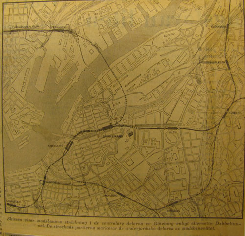 ”Göteborgs spårvagnar får stå bi i ännu mer än tio år eller så innan det kan bli tal om begynnande avlösning med tunnelbanevagnar. Snabbspårvägsutredningen, som efter fem års utredningsarbete på fredagen fick resultatet av sina mödor presenterat av utredningschefen överingenjör Erik Sylvén vid en sammankomst i lilla börssalen inför en stor samling kommunala förtroendemän och tjänstemän, konstaterar att den första etappen, som anses kunna påbörjas 1973 och stå färdig fem år senare, omfattar en tunnel Ullevigatan – Brunnsparken – Järntorget – Sveagatan, temporärt anknuten till de spårvägslinjer som finns i Stampgatan och vid Karlsroplatsen.