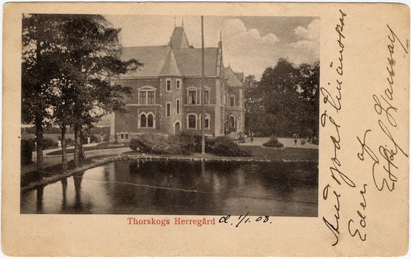 Bilden i sidhuvudet är hämtad från Digitalt Museum: Thorskogs slott är beläget i Torskog i Lilla Edets kommun i Bohuslän. Slottet byggdes 1892 ett par hundra meter från Göta älv, på älvens västra strand. I dag är Thorskogs slott konferensanläggning och festvåning.