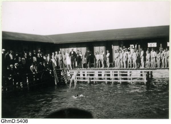 ”Simuppvisning med folkskolebarn kommer i morgon att ega rum, med flickorna kl. 9 f. m. och med gossarne kl. 4 e. m. För simkonsten intresserade damer och herrar hafva tillfälle att härvid närvara i Löfströmska badbassinen vid Hisingbron.” (Ur: Göteborgs Aftonblad 14 augusti 1896)