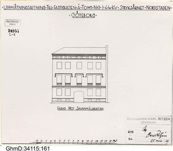 Bilden i sidhuvudet är hämtad från Göteborgs stadsmuseum, Carlotta:Uppmätningsritning till fastigheten å tomt no 3 i 4de kv. Strykjärnet Nordstaden Göteborg. Fasad mot Spannmålsgatan.