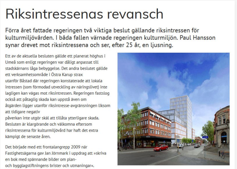 Under rubriken ”Riksintressenas revansch” skrev Paul Hansson 2013 en läsvärd artikel i Byggnadsvårdsföreningens tidskrift om hur områden utsågs till Riksintressen och hur exploatörers företrädare försökt att nedvärdera deras betydelse. Debatten om riksintressena har fortsatt och det ledde Paul Hansson att skriva en ny debattartikel 2014 tillsammans med Stephan Fickler, som du kan läsa via denna länk.