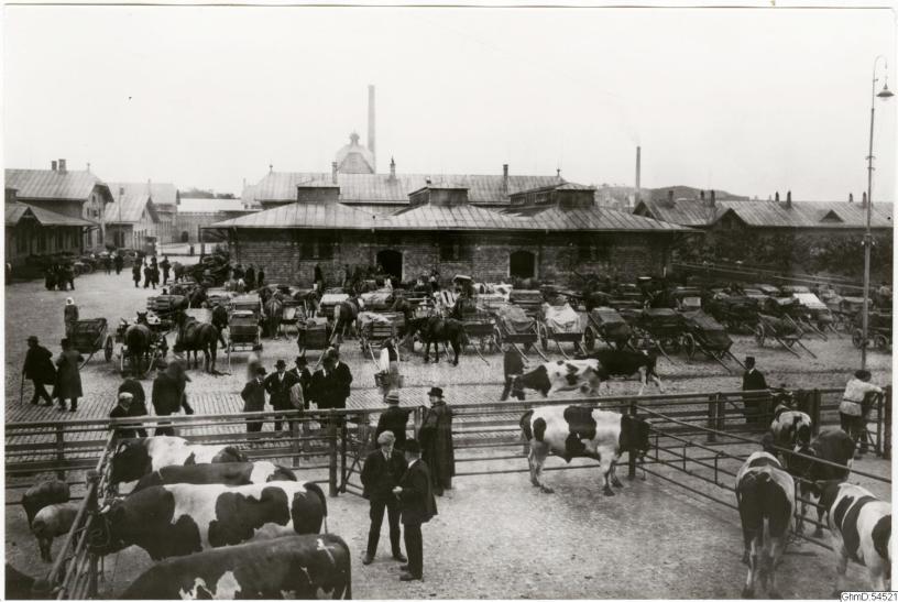 Bilden i sidhuvudet är hämtad från Göteborg stadsmuseum, Carlotta: Bild över slakthusområdet på 1910-talet, med byggnader och inhägnader med djur. Mitt i bild, uppställningsplats med kärror.