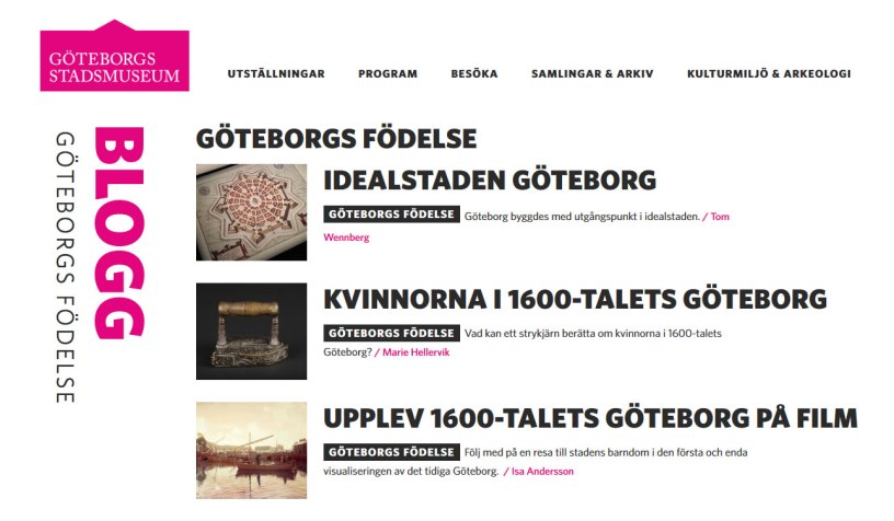 Göteborgs stadsmuseum har startat en blogg kring temat och utställningen Göteborgs födelse. I går publicerades ”IDEALSTADEN GÖTEBORG” av Tom Wennberg och sedan tidigare finns ”Kvinnorna i 1600-talets Göteborg” av Marie Hellervik samt ”Upplev 1600-talets Göteborg på film”.