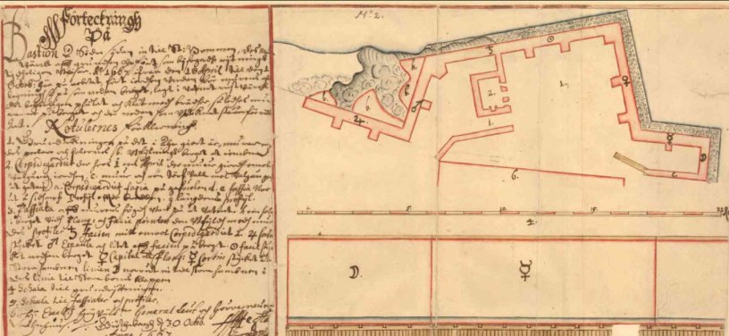 Kartan i sidhuvudet: Göteborg. Relationer. Förteckningh På Bastion å Södre sijdan in till St: Bommen, des Muur Wärck aff grundhen opfört som bifogadhe rijtningh tydligen Wiisar Ao 1667 ifrån den 18. April till den 1 Octob: här på arbetet… [Fortifikationens ritningar har med hänsynstagande till den ursprungliga ordningen uppdelats i tre huvudavdelningar, nämligen relationer,. förslag och planer. Relationernas utgörs av de berättelser över fästningens tillstånd,. vilka fortifikationsbefälhavarna var skyldiga att årligen insända till. generalkvartermästaren i Stockholm. Enligt 1695 års. fortifikationsordning skulle berättelserna innehålla en utförlig. redogörelse för det fästningsarbete, som utförts under året, samt en. färglagd ritning över fästningen, varvid med särskilda färger skulle. anges de verk, som anlagts. Relationerna avspeglar sålunda det faktiska. läget och ger en god bild av fortifikationsarbetenas utveckling inom. fästningarna.]