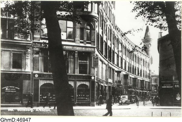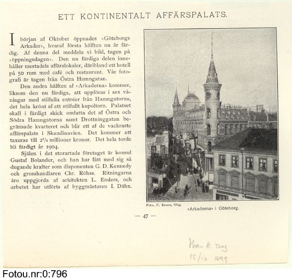 I början af Oktober öppnades ”Göteborgs Arkader”, hvaraf första hälften nu är färdig. Af denna del meddela vi bild, tagen på ”öppningsdagen”. Den nu färdiga delen innehåller mestadels affärslokaler, däribland ett hotell på 50 rum med café och restaurant. Vår fotografi är tagen från Östra Hamngatan.