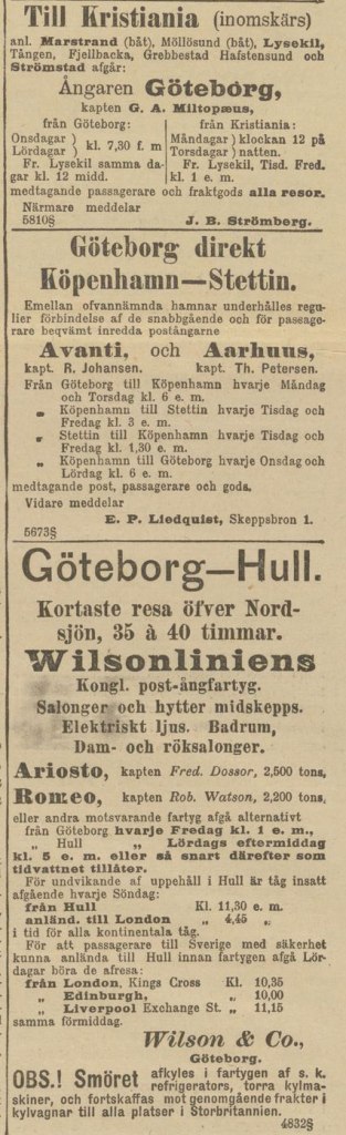 För 120 år sedan rådde det nyhetstorka i Göteborgs Aftonblad, dagens utdrag ur tidningen blir därför en bild som visar några olika annonser för resor med fartyg. Kanske vill du åka till Kristiania (d.v.s. Oslo), till Stettin, Avanti och Aarhuus om det inte är så att Hull lockar mer!