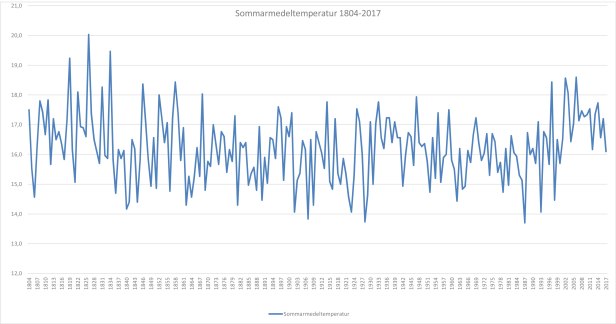Medeltemperaturen för juni, juli och augusti var i år 16,1, normalt för hela perioden 1804-2017 var 16,2 oavsett om man använder medelvärde eller medianvärde. Det var alltså en normalvarm/kall sommar som vi fick i år.