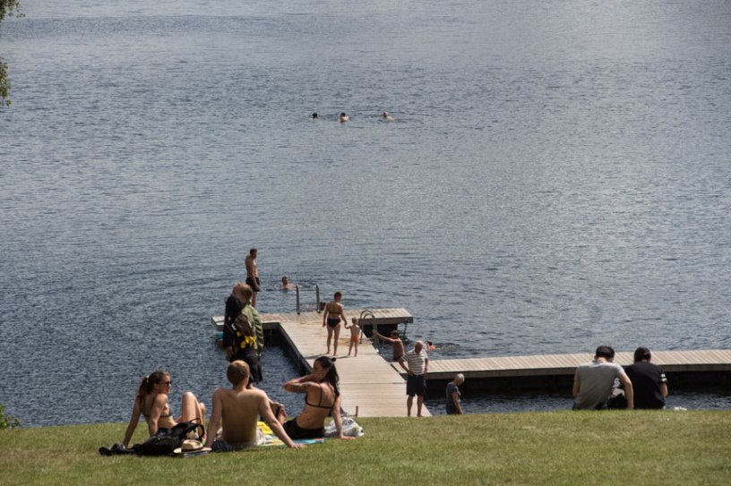 Bilden i sidhuvudet visar badplatsen vid Stora Delsjön sommaren 2017. Foto: Per Hallén.