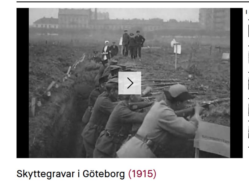 Filmarkivet.se har lagt upp en kortfilm som visar hur militären visade upp hur skyttegravskriget gick till: ”Intresset för första världskrigets skyttegravskrig på västfronten tog sig många uttryck. Kulturpersonligheter som Sven Hedin och Marika Stiernstedt reste till västfronten och förmedlade sina intryck i böcker och föredrag. I Sveriges större städer, till exempel i Göteborg, byggdes skyttegravsbefästningar dit allmänheten hälsades välkommen att bese löpgravar och skyttevärn, allt för att få inblickar i samtalsämnet för dagen.”
