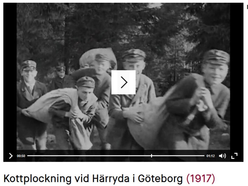 Via Filmarkivet.se finns en kortare film från året 1917, ”Försörjningsförhållandena i Sverige var ansträngda vad gällde såväl livsmedel som bränsle och drivmedel. Bränslebristen fick till exempel till följd att befolkningen tvingades ta tillvara på det mesta som skogen och naturen kunde erbjuda, till exempel att använda kottar som bränsle. Journalfilmsinslaget från Hasselblads visar hur skolungdomar skickats ut i naturen för att samla in de åtråvärda kottarna.” Se filmen via denna länk.