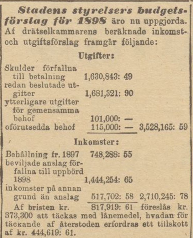 Budgetläget pekade mot ett ganska rejält underskott i stadens kassa inför 1898. Det saknades 444 619,61, vilket motsvarar 29 891 125 SEK år 2017 mätt med konsumentprisindex (historia.se).