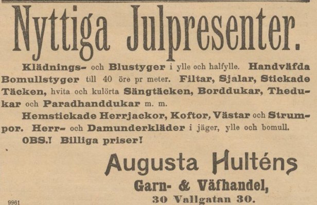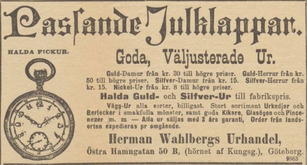 Julen närmar sig snabbt och det är hög tid att tänka på både klappar och mat. Det fanns många annonser i tidningarna 1897 och jag återger här ett axplock ur Göteborgs Aftonblad den 4 december 1897.