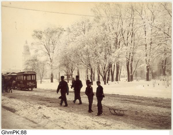 ”Väderleken. Lite vinter ha vi äntligen fått smaka på. I lördags afton lär termometern visat — 10 gr., i går morse stod den ännu vid — 8 gr. Förmiddagen erbjöd det vackraste promenadväder: strålande solsken och några få graders köld. I går afton rådde en rätt bitande blåst med snöyra. När man i morse vaknade tedde staden den vackra anblicken af snötäckta tak och gator, och snötäcket var så pass godt att det lockat ut en och annan slädfarande. som med bjellerklang lifvade gatorna och höjde vinterstämningen.