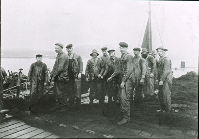 Ett vadlag arbetar arbeta med en sillvad. Männen är klädda i oljeställ, vegamössa och träbottnade stövlar.