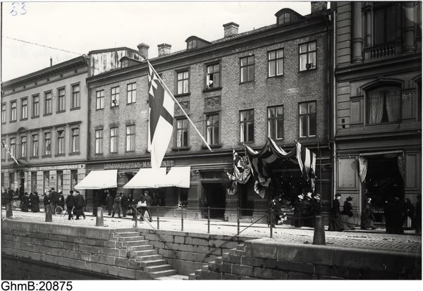 Uppe å skolplanen vid Oscar Fredriks skolhus stodo småbarnen uppstälda sedan kl. half tio. Alla med blågula vimplar i händerna, blåfrusna och huttrande i det ruskiga vädret. Å norra sidan hade sångarne tagit plats bakom en plattform för sånganföraren hr Edberg.