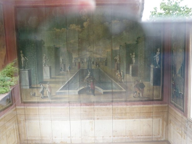 Väggarnas dekorationer äro intressanta. Stående framför fondväggen har man bilden av en trädgård med höga boskéer och marmorstatyer vid sidorna.