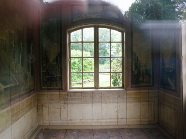 – Dina, Mercurius, Athena, Mars, Jupiter, Flora, Apollo och Venus – en stensatt damm med fontän i mitten och lite varstädes lustvandrande damer och herrar. Boskéträdgården begränsas av ett gallerverk och bortom detta synes en trädomgiven parterr framför anläggningens Corps de logis. De övriga väggarna äro vardera uppdelade i tre dekorationsfält. Hörnfälten avbilda sjöstycken och hamnar med fartyg samt ståtliga palats med kanaler, kajer och parker, allt med staffage av promenerande eller samtalande figurer. Claude Lorain’s berömda hamnbilder ha varit inspirerande förebilder för dessa enkla målningar. De små fälten över fönster och dörrar visa bilder av landskap med trädgårdar och parker, även dessa befolkade med staffage.