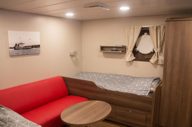 Hytterna liksom övriga utrymmen ombord är genomtänkta både när det gäller funktion, material, färger och stil.