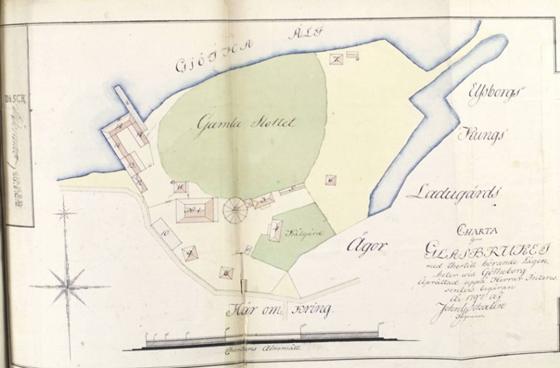 - En glasbruksbyggnad av gråsten sammanbyggd med en materialbod uppförd 1784. 2, En glasbruksbyggnad av korsvirke samt en materialbod. 3-4, byggnader för glasblåsare. 5, Uthuslänga. 6, Bakstuga. 7, Värdshus samt en vedbod. 8, Glasstens stamp. 9, Byggnad för månadstjänarna. 10, Vedbod. 11, Byggnad för bokhållaren. 12. Bostad i två våningar för salteriarbetarna. 13. Materialbod och vedbod. 14. Salteri.. 15, Hemlighus. 16. Utskeppningsplaner. (Källa: BRFV Fnr:03023 Örgryte socken 1797.)