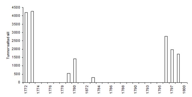 Källa: Förtekning på den sill, som Götheborgs herrar handlande år /—/, uti Götheborgs skärgård låtit insalta och röka; samt huru många fat tran af 60 kannor hvardera kokat blifvit. 1772-1800. (Lars Nilssons handlingar, GLA)