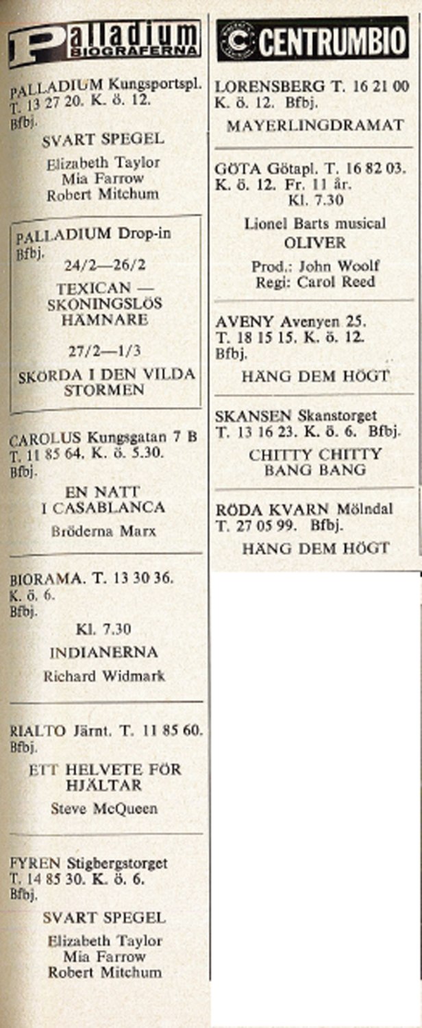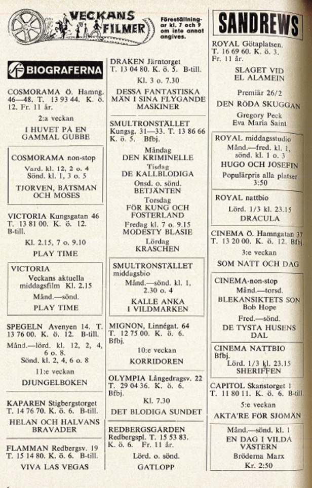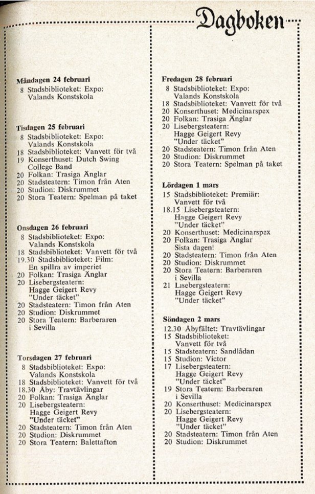 Glädjande nog börja alltfler ungdomar fråga efter Göteborg Denna Vecka. Kanske är det bioannonserna och Danstabellen som intresserar mest. Faktum är emellertid att den finns i allt flera handskfack i ungdomsbilar, i fickor och handväskor, för att behändigt tas fram och rådfrågas när gänget eller flickan diskuterar ”vad skall vi göra i kväll”.