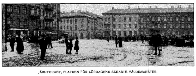 På Järntorget träffades polismästaren af en sten i nacken, så att han föll till marken. Sedan han blifvit förbunden på det vid torget liggande apoteket, fördes han till polisstationen.” (Ur: Dagens Nyheter 10 mars 1902)