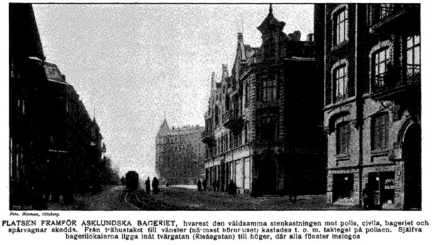 ”Om de i telegram omtalade gatuuppträdena i Göteborg i lördags föreligga nu mera detaljerade upplysningar. Redan vid 7-tiden på kvällen samlades på gatorna kring Asklunds ångbageri stora folkskaror. När mörkret fullständigt fallit på, voro Husargatan och närliggande sidogator besvärade af en förfärlig folkträngsel. Man väntade hvarje ögonblick att våldsamheter skulle utbryta, och en ansenlig polisstyrka hade utkommenderats. Om man icke räknar enstaka rop och hotelser från de tätt packade arbetarskarorna, var allt lugnt till 9-tiden, då upploppet började antaga allvarligare karaktär. Nu började stenar hagla genom luften, slungade mot ångbageriet, hvars stora, dyrbara skyltfönster delvis krossades. Ridande polis började anlända till platsen, som — jämte de med battonger beväpnade polistrupperna till fots — gång på gång rensade gatan och äfven använde vapnen, då motståndet blef våldsamt. Men så snart folksamlingarna skingrats på en gata, strömmade de åter tillsammans från andra platser, och så pågick tumultet till kl. 10 med en ständig omsättning af massorna. Kl. 10 anlände polismästaren i uniform och gick från flock till flock under lugnande förklaringar och bevekligt uppmanande de upphetsade massorna att skiljas åt i lugn och lita på myndigheternas opartiskhet och rättvisa. Inga öfvertalningar hjälpte, excesserna och förbittringen tilltogo snarare. Då vände sig polismästaren till redaktör Lindblad, utgifvare af den socialistiska tidningen Ny Tid, som befann sig på platsen, och anmodade honom att bruka sitt inflytande för att lugna massorna. Hr Lindblad efterkom uppmaningen och bad hvar och en gå till sitt. Själf gick han jämte polismästaren först därifrån, hvarefter hela den kolossala folkmassan följde i deras fotspår under sång af ”Socialistmarseljäsen Arbetets söner”.