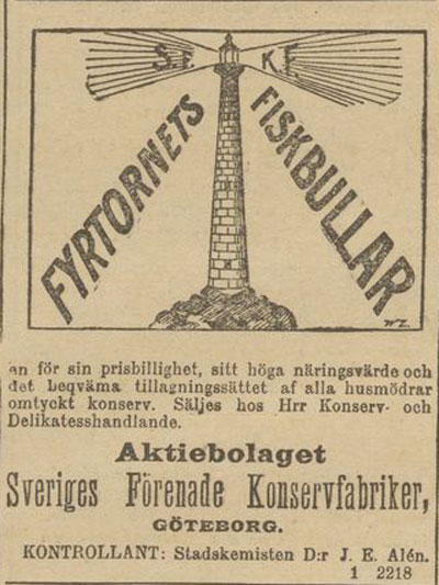 ”Fyrtornets fiskbullar. Under detta märke har Aktiebolaget Sveriges förenade konservfabriker sedan någon tid fört i marknaden de för några år sedan af de norska konservfabrikerna först introducerade fiskbullarne, hvilka genom sin prisbillighet kommit till en så stor förbrukning här i landet, men hvaraf införseln genom mellanrikslagens upphörande afstannat.