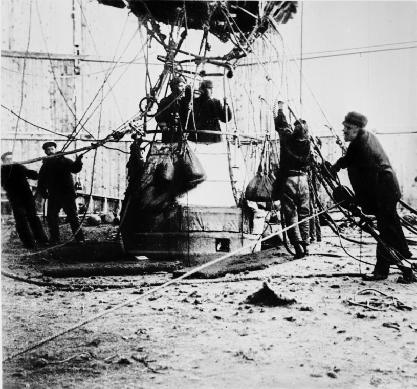 Bilden i sidhuvudet är hämtad från Digitalt museum: Någon minut före starten. I gondolen står Andrée längst till vänster, bredvid honom Strindberg. Mellan dem skymtar Fraenkels rygg och nacke.