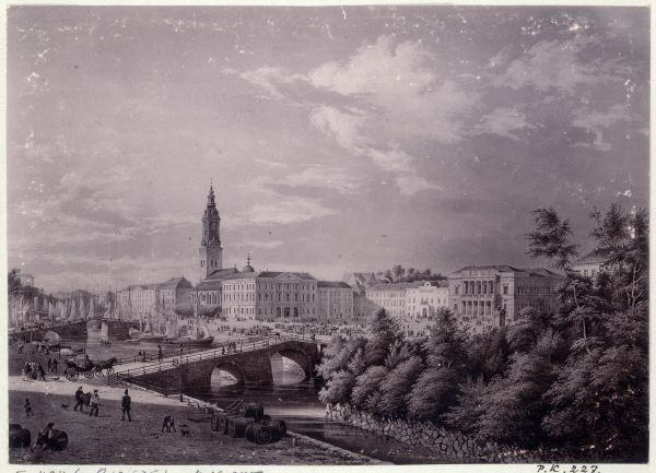 Bilden i sidhuvudet visar området från tiden före 1854 (statyn är ännu inte rest på Stora Torget/Gustav Adolfs torg) visar Brunnsparken till höger. Det är lätt att förstå att parken ibland kallades ”Paradiset”. Bilden är hämtad från Göteborgs stadsmuseum, Carlotta.