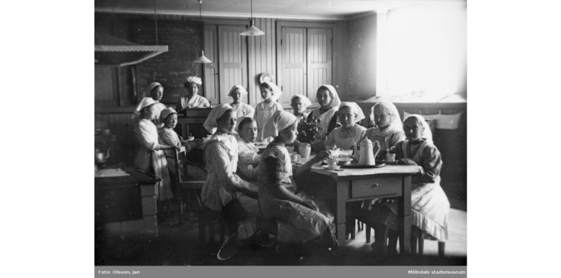 Bilden i sidhuvudet är hämtad från Digitalt museum: Läraren Hilda Olsson med elever i Trädgårdsskolans skolkök, år 1910. Trädgårdsskolan (senare kallad Träskolan, revs 1986) låg där Kvarnbyskolan har sin skolgård