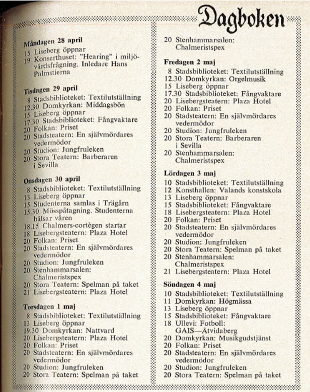 Jovisst, säjer ni kanske, så var det. Så hade vi det. Men Trägårn har ju brunnit. Alldeles riktigt. Men riktigare och viktigare är att den byggts upp igen, trätt fram som en fågel Fenix i den begynnande grönskan som en fågel Fenix i den bebyggande grönskan. Och på Valborgsmässoafton går vi dit allihop och återinviger Trägårn. Festligt göteborgskt.