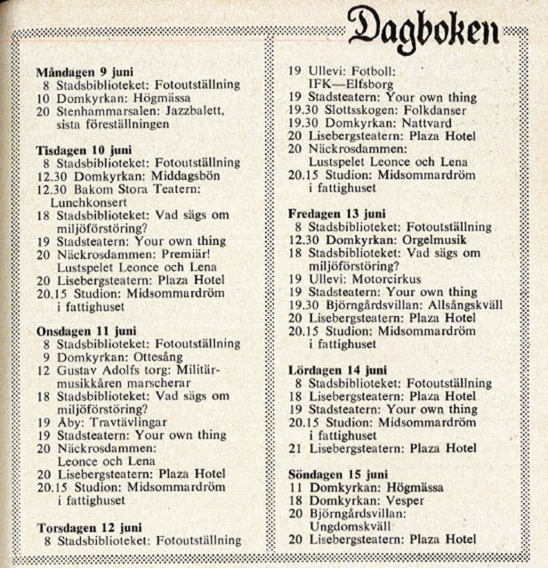 Det har varit urpremiär på Stadsbiblioteket med ett program om miljöförstöringen. Programmet, i form av ett collage, har sammanställts av en grupp skådespelare från Göteborgs Stadsteater som också medverkar på scenen; Maria Hörnelius, Birgitta Palme, Birgitta Stahre, Haakon Svensson, Wiveca Warnefalk. Scenograf är Barbara W. Öberg.