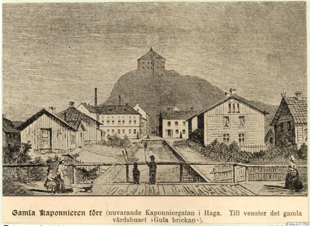Likaledes bör å den s.k. Hagaheden, hvilken är den förstad, som står längst tillbaka i afseende på snygghet och ordning, på två eller tre serskilda ställen lämpliga trummor eller afledningsrör anordnas med ordentligt affall genom nya Alléen nedåt Vallgrafven. Särskildt få Kommitterade förorda att nämnde åtgärd sträcker sig till den s.k. Skojarebacken, på det att all den der befintliga orenligheten må finna aflopp.