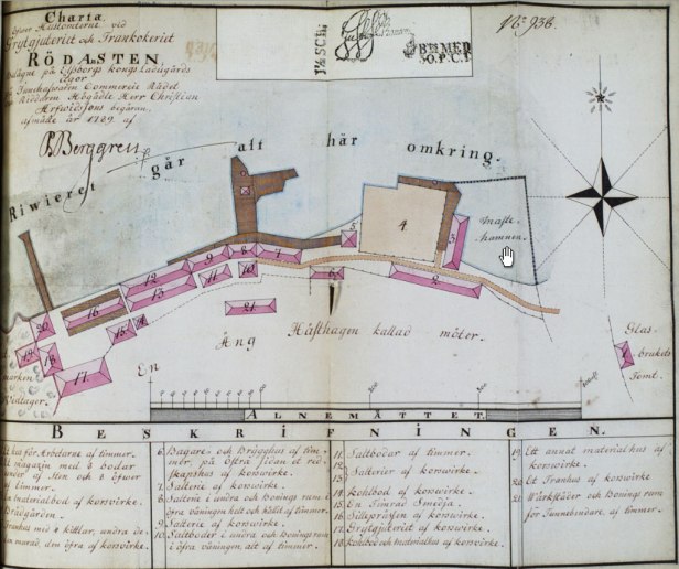 - Träbyggnad uppfört 1764. 2. Lagerhus uppfört 1757. 3. Materialbod uppförd 1781. 4. Brädgård på 4059 kvadratalnar, inhägnad med plank. 5. Tranhus uppfört 1786 med 3 st. kopparkittlar. 6. Bagarehus och brygghus uppfört 1781. 7. Salteribod uppförd 1759. 8. Bostadshus i två våningar där den under byggts 1759 och den övre 1769. 9. Salteribod uppbygd 1759. 10. Salteribod i två våningar där den under är salteri och den övre våningen bostad. Uppförd år 1759. 11. Saltbod uppförd 1769. 12. Salteribod uppförd 1769. 13. Salteribod uppförd troligen 1769. 16. Hus för disponenten uppfört 1756. 14-15, 17-19. 20. Tranhus byggt 1765. 21. Tunnbindarnas hus byggt 1756.