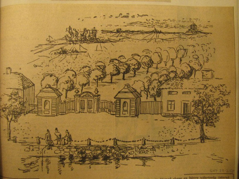 Bilden i sidhuvudet är hämtad ur GHT 22 februari 1958: Om stadsingenjör C.W. Carlberg fått ett förslag på en allé ute på Stampen antagen för att därmed skapa en bättre utfartsväg österut så hade kanske stadsdelen fått ett annat utseende och stadens centrum dragits mer åt öster. Kanske hade då inte Drottningtorget fått sin nuvarande utformning med det stora posthuset som en propp mot öster. Här syns den pampiga fyrradiga allé enligt hans förslag med eleganta portar i båda ändra av allén. Skiss efter Carlbergs ritningar av Bertil Lundgren.