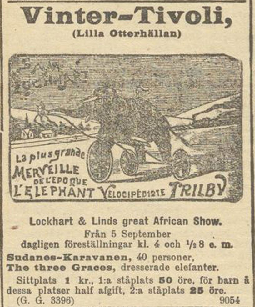”Å Göteborgs Vinter-Tivoli uppträder från och med i morgon en Sudanes-karavan af 40 personer. Dessutom förevisas tre dresserade elefanter, “the three gracesw, hvilka lära vara något i sitt slag enastående. Två föreställningar gifvas dagligen, den ena kl. 4 e. m. och den andra kl, 1/2 8 e. m.” (Ur: Göteborgs Aftonblad 4 september 1899)