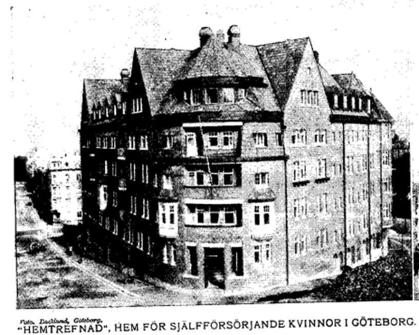 ”Hemtrefnad” ett i hörnet af Erik Dahlbergs och Förenings-gatorna i Göteborg uppfördt ståtligt trevåningshus afsedt för bildade själfförsörjande kvinnor och för