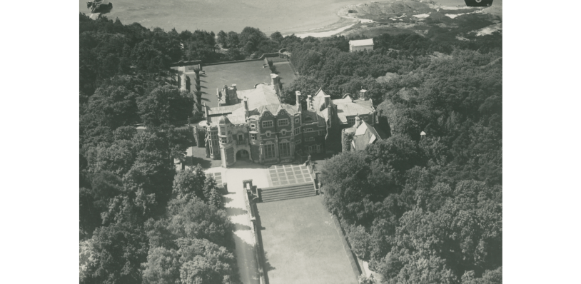 Den ståtliga byggnaden uppföres som förut omtalats i engelsk slottsstil och beklädes utvändigt med granit. Af en del detaljer, som nu äro färdiga, erhåller man genast intryck af det storartade i anläggningen. Stora portalen t. ex., som är i det närmaste färdig. Mellan väldiga granitpelare leder en bred men låg trappa upp till en liten förhall, från hvilken den förhållandevis ganska smala dörren för in till slottets inre. Öfver den af granit uppförda portalen hvila tvenne i granit uthuggna lejon i kroppsstorlek.