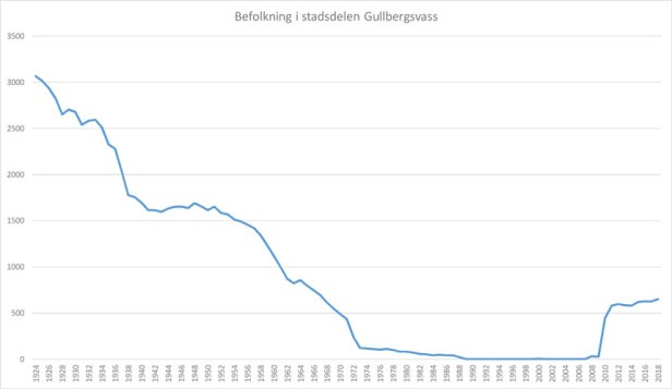 Diagrammet över befolkningsutvecklingen skildrar tydligt denna historiska utveckling. När stadsdelen bildades 1924 bodde över 3 000 personer där. Antalet minskade sedan stadigt ned mot nära noll antal invånare under början av 1970- och 1980-talen. Det var först efter att de nya husen vid Friggagatan stod klara som stadsdelen åter fick omkring 500 invånare.