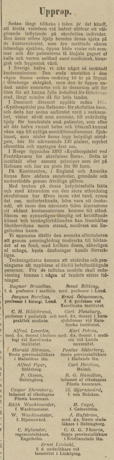 ”Ett upprop, som i sin helhet återfinnes å annat ställe i dagens nummer, har utfärdats af ett antal framstående läkare m. fl. till bildande af en fond för åstadkommande af ett större svenskt kustsanatorium för skrofulösa personer. Den enda anstalt i denna väg som förut finnes i Sverige är som bekant belägen på Styrsö, och den är öppen endast under somrarne och är dessutom tilltagen i mindre skala. Såsom en synnerligsn lämplig ort för ett dylikt sanatorium framhålla uppropets utfärdare Skeldervikens norra strand, nordvest om Engelholms hamn. Teckningslistor komma inom kort att utsändas.” (Ur: Göteborgs Aftonblad 20 februari 1900)