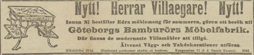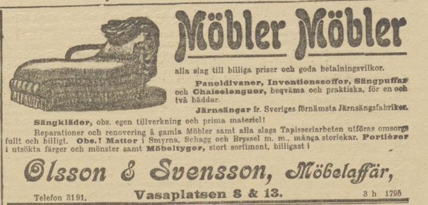 Vid Vasaplatsen kunde du år 1900 handla möbler i Olsson & Svenssons möbelaffär. Kanske vill du heller köpa bamburörsmöbler? Då får du gå till Kungsgatan 11, se bilden i sidhuvudet.
