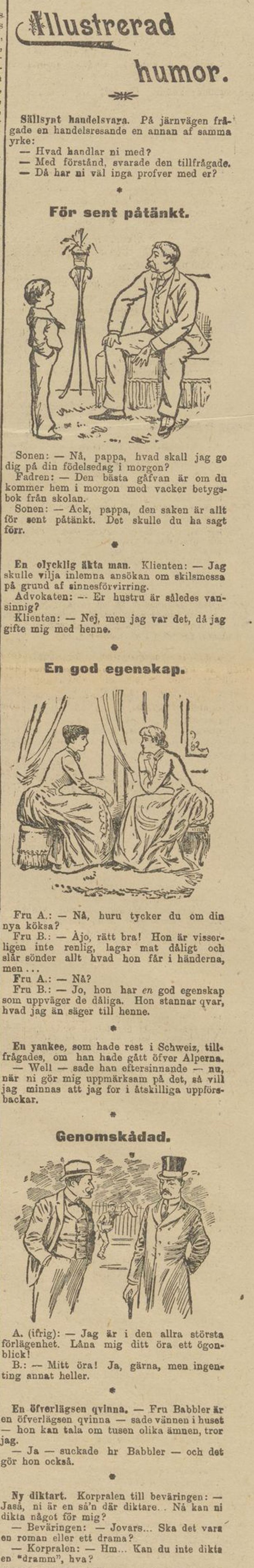 Går det fortfarande att bli road av 120 år gammal humor? Det kan du pröva idag och läsa igenom detta utdrag ur Göteborgs Aftonblads illustrerade humor.