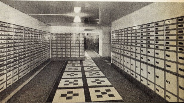 Bilden i sidhuvudet visar exteriör av A.-B. Göteborgs Banks huvudkontor vid Västra Hamngatan och Lilla Torget. Restaurerad år 1930 är byggnaden nu ett av stadens ståtligaste affärspalats.