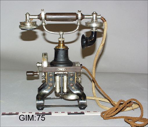 Bilden i sidhuvudet är hämtad från Göteborgs stadsmuseum, Carlotta: bordstelefon med vev. ”Taxbenen” består av U-magneter mellan vilken en spole är belägen. Med veven skapas en induktionsström för signal till växelstationen. Luren har ljudtratt och kolkornsmikrofon. Synlig ringklocka. Benen är svarta med dekor i guldfärg. 1892-1900.