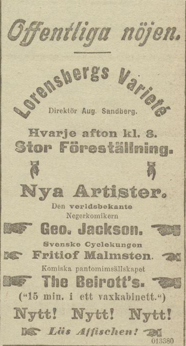 ”Lorensbergs varieté bjuder nu på helt och hållet nytt program, hvilket i går hade lockat fullt hus. Den största dragningskraften är måhända den genom-rolige negerkomikern Geo. Jackson, säkerligen känd af alla, åtminstone till namnet. Vidare ha vi på programmet den svenske cyclekungen Frithiof Malmsten, hvilkens prestationer å cycle voro häpnadsväckande. Genée-Duo belönades med smattrande applåder, då de bland “olika nationers danser“ äfven visade huru man dansar i Göteborg.