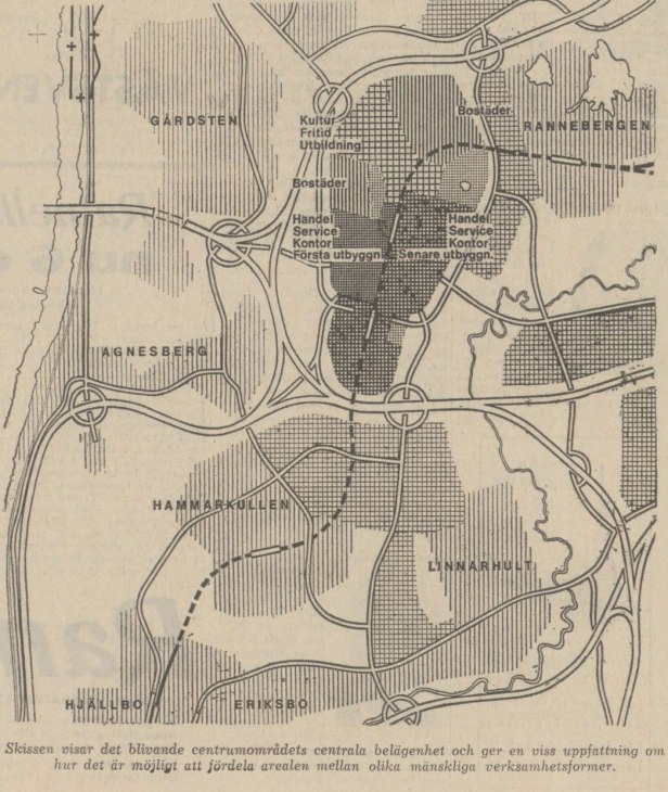 ”Det blir ingen kritikstorm à la Skärholmen kring Angereds centrum om intentionerna i den centrumutredning, som på tisdagen framlades i byggnadsnämnden, fullföljs i detaljplaneringen. Centrumutredarna generalplanekontoret och konsultföretaget Vattenbyggnadsbyrån — det vill närmare bestämt säga generalplanechefen Axel Lund och arkitekten N-F Leufstadius — understryker vikten av att inte låsa centrumutvecklingen för lång tid framöver. Det ska i stället redan i sin första etapp göras så flexibelt redan på ritbordet att dess naturliga och kontinuerliga tillväxt inte hämmas.