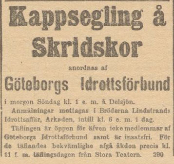 ”Den beramade skridskoseglingen i går middag hade lockat flere tusen personer ut till Delsjön. På vägen ut genom Örgryte och förbi Stora Torp ringlade sig en väldig ström af folk, och på sjöns is formligen myllrade det af promenerande. En hel del hade tagit med sig fotografikameror för att på sina plåtar föreviga täflingen.
